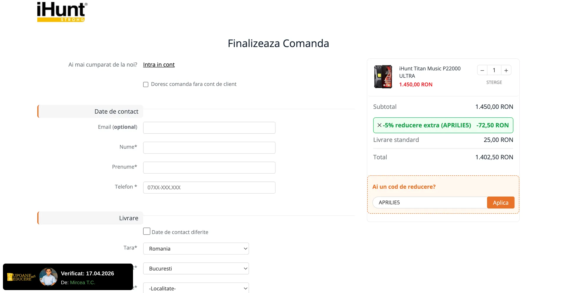 Mircea T.C. a verificat și confirmat codul prin aplicarea acestuia în coșul de cumpărături ·