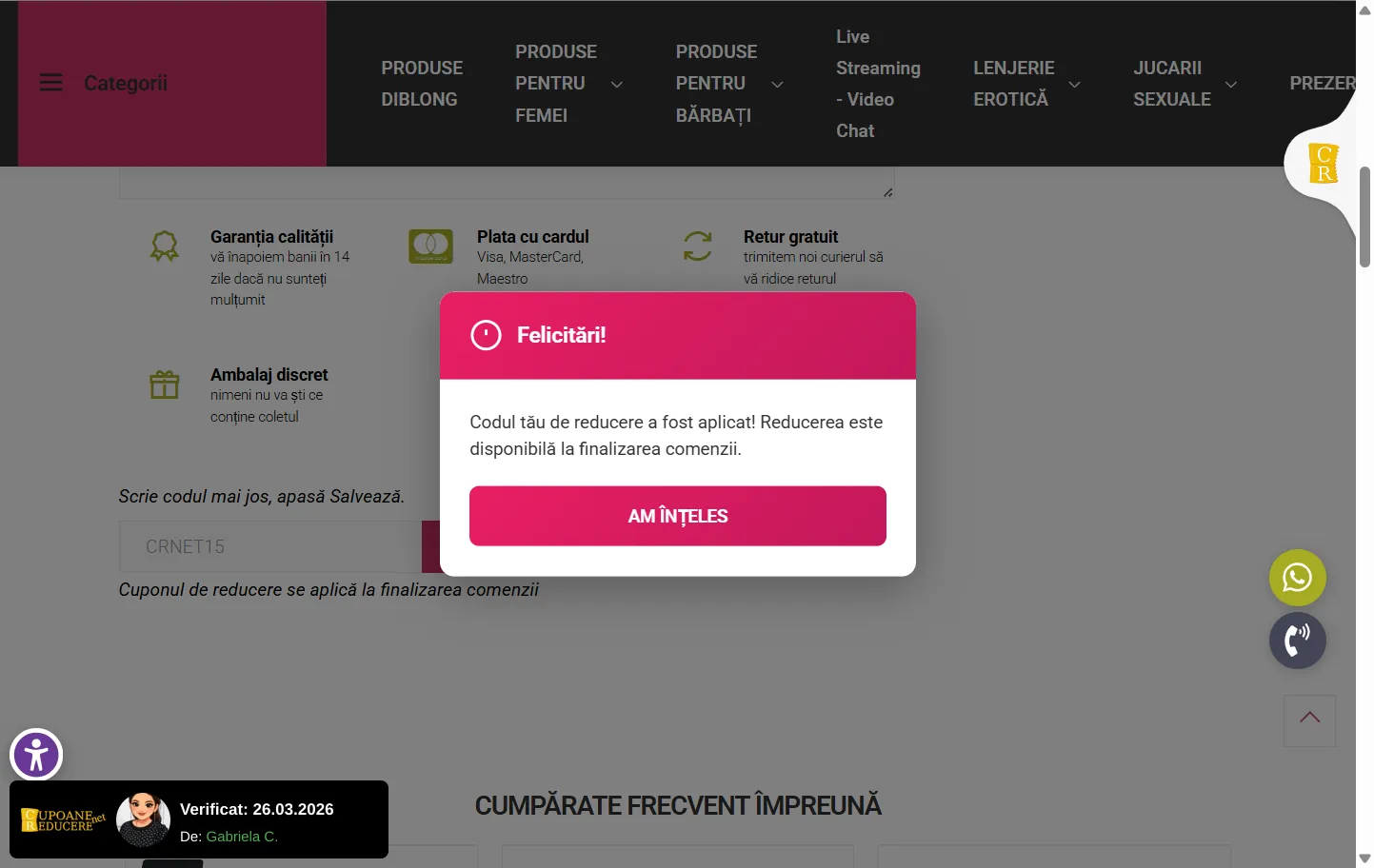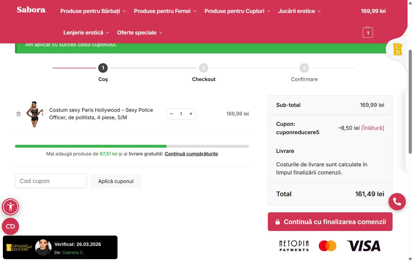 Gabriela C. a verificat și confirmat codul prin aplicarea acestuia în coșul de cumpărături ·