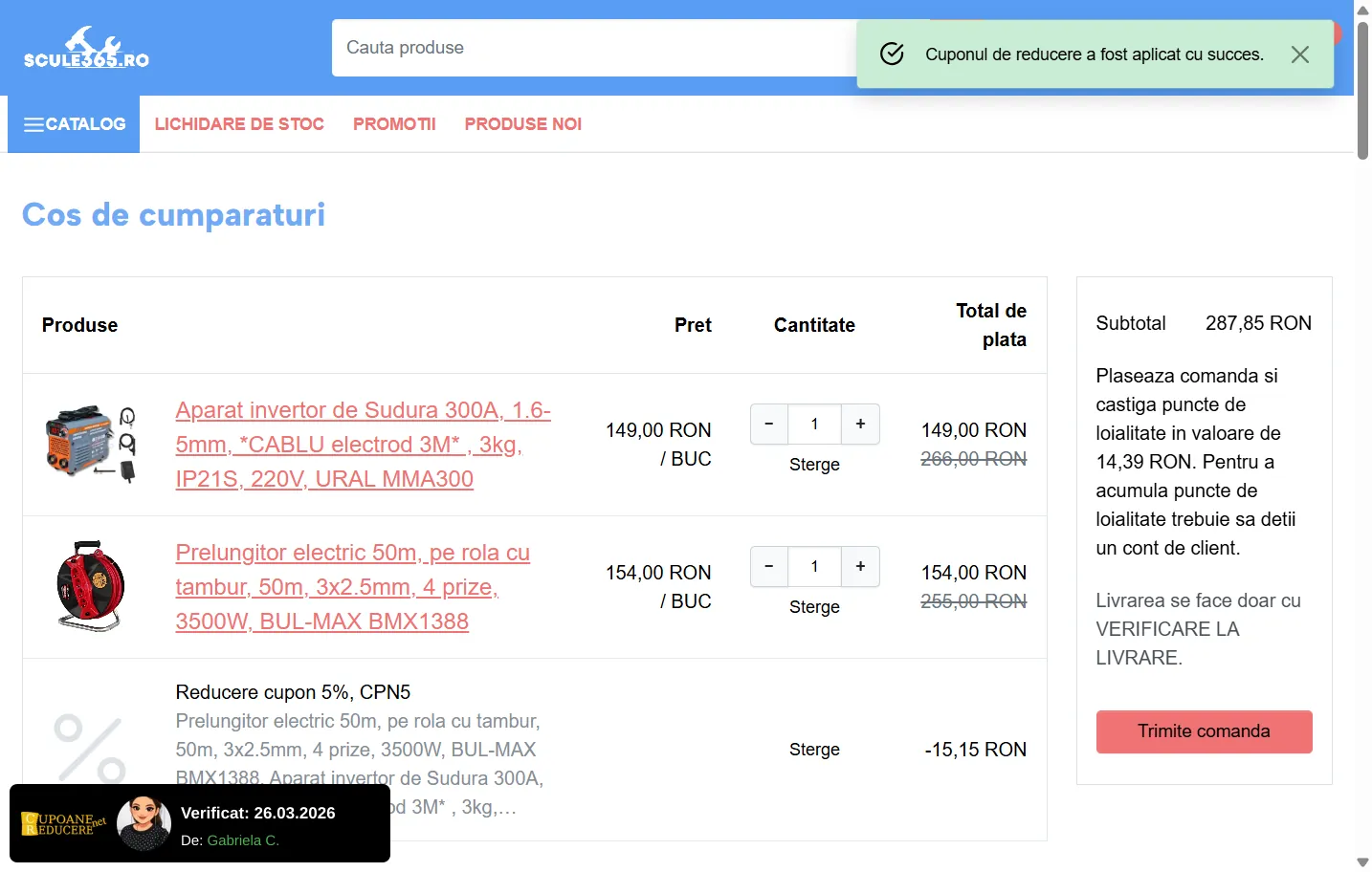 Gabriela C. a verificat și confirmat codul prin aplicarea acestuia în coșul de cumpărături ·