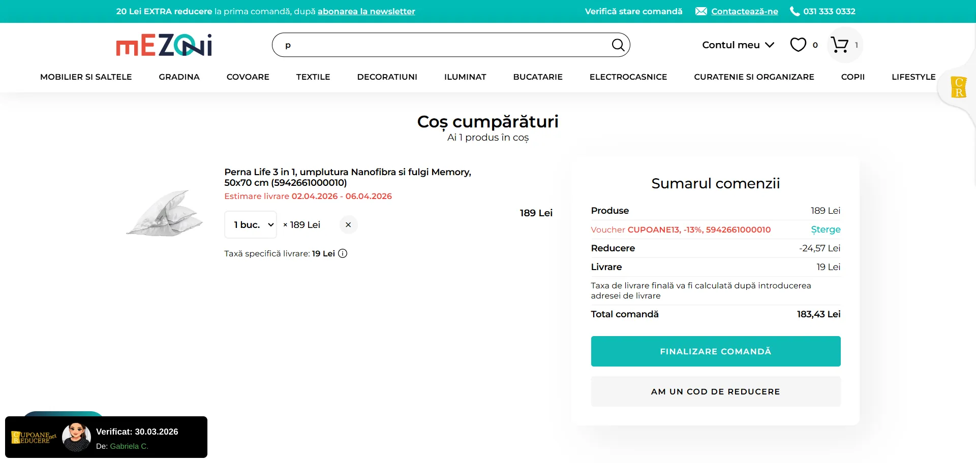 Gabriela C. a verificat și confirmat codul prin aplicarea acestuia în coșul de cumpărături ·