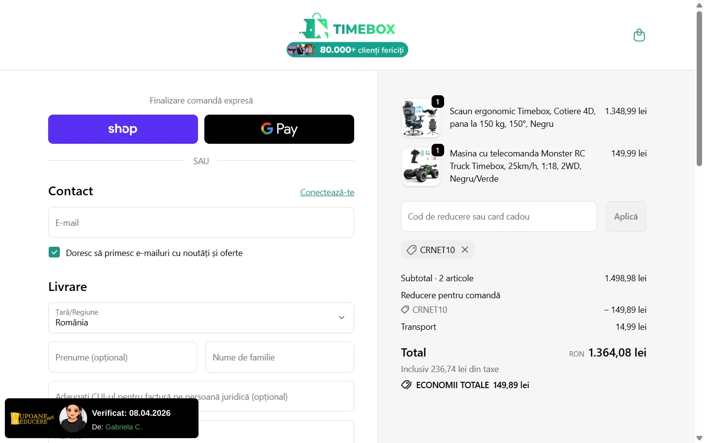 Gabriela C. a verificat și confirmat codul prin aplicarea acestuia în coșul de cumpărături ·