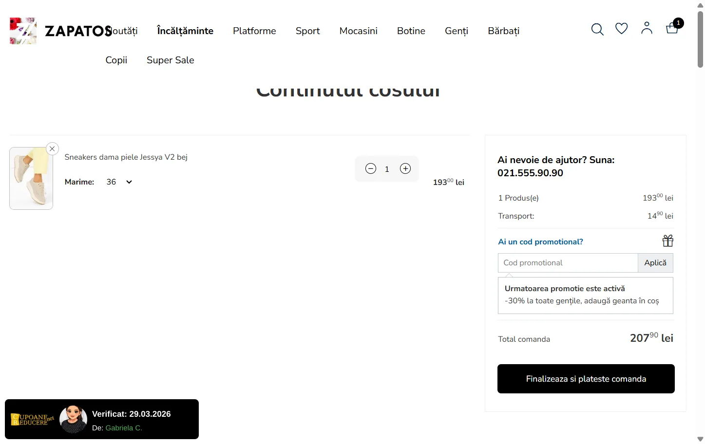 Gabriela C. a verificat și confirmat codul prin aplicarea acestuia în coșul de cumpărături ·